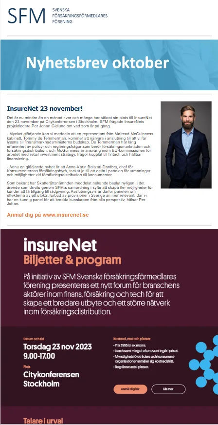 Nyheter 2023-11-06 SFM nyhetsbrev Oktober Läs hela nyhetsbrevet här Fler nyheter 2026-02-10 Tove Hässler deltar i panelsamtal på Di Försäkring 2026 2026-02-02 Nyhetsbrev januari 2025-12-18 Nyhetsbrev december 2025-12-18 SFDR – EU-kommissionen föreslår lättnader för försäkringsförmedlare 2025-11-06 InsureNet: Framtidstro mitt i förändringen 2025-10-23 Nyhetsbrev Oktober